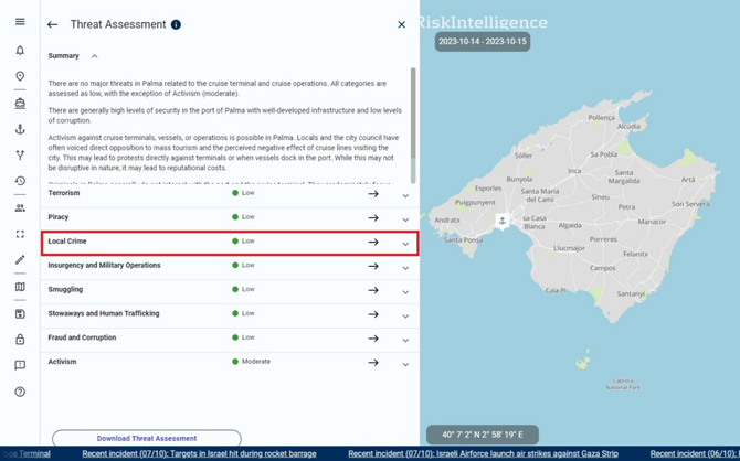 If you click on one you get a very similar display to the other ports, but the Threat Assessment is slightly different, as it contains a category called 'Local Crime'. Threat assessments for the cruise terminals will also have a cruise-industry focus.