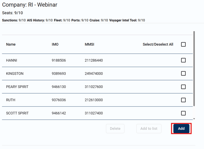 This is done by pressing the 'Add' button for individual vessels, or by uploading larger lists of vessels by pressing the 'Upload' button.