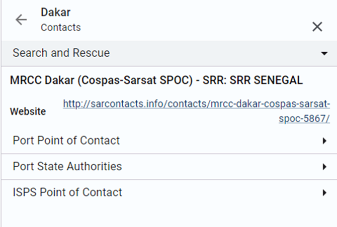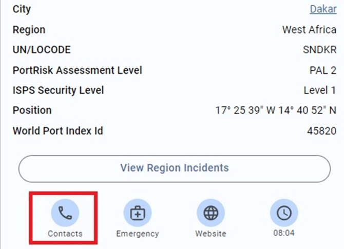 Clicking on the 'Contacts' icon displays a list of relevant contact details such as 'Search and Rescue', 'National point of contact', 'ISPS point of contact' and a 'Port point of contact'.