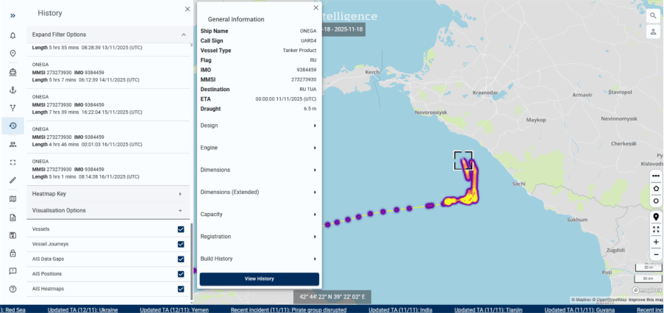 - 'Heatmap Key' is the indicator for the heatmap function, which can be toggled on in 'Visualization Options' – the heatmap is based on the increasing density of AIS broadcast, i.e. where the vessel has sent the most AIS signals.